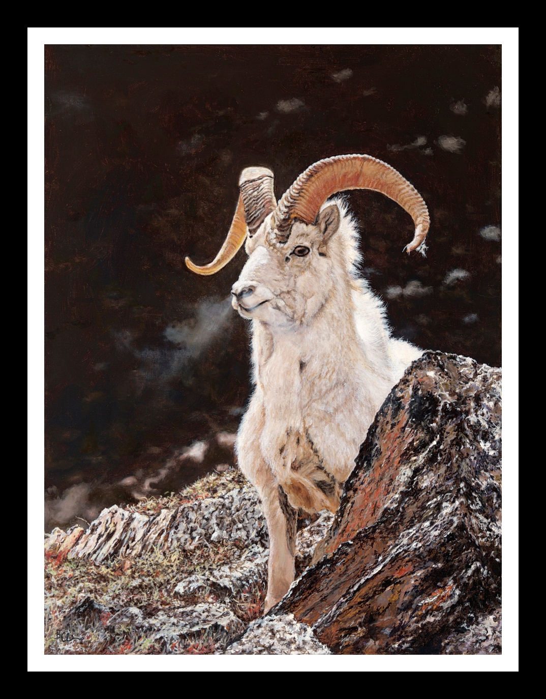 This striking oil on canvas by Fine Art Artist Bonnie Collins captures a majestic Dall sheep perched on a rocky ridge.