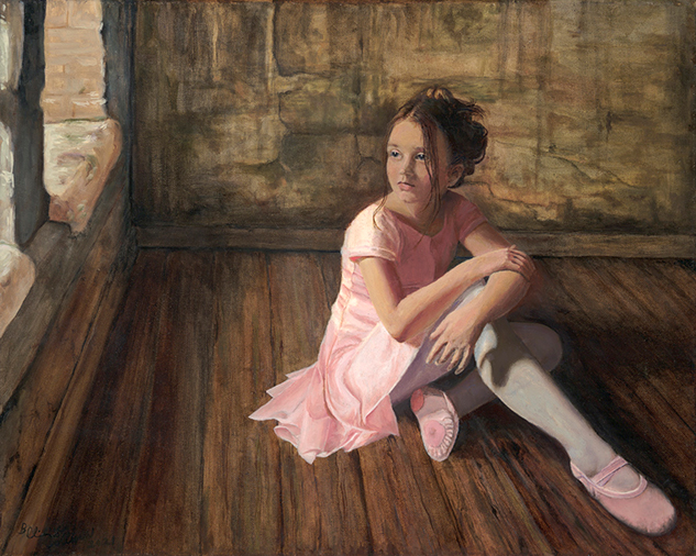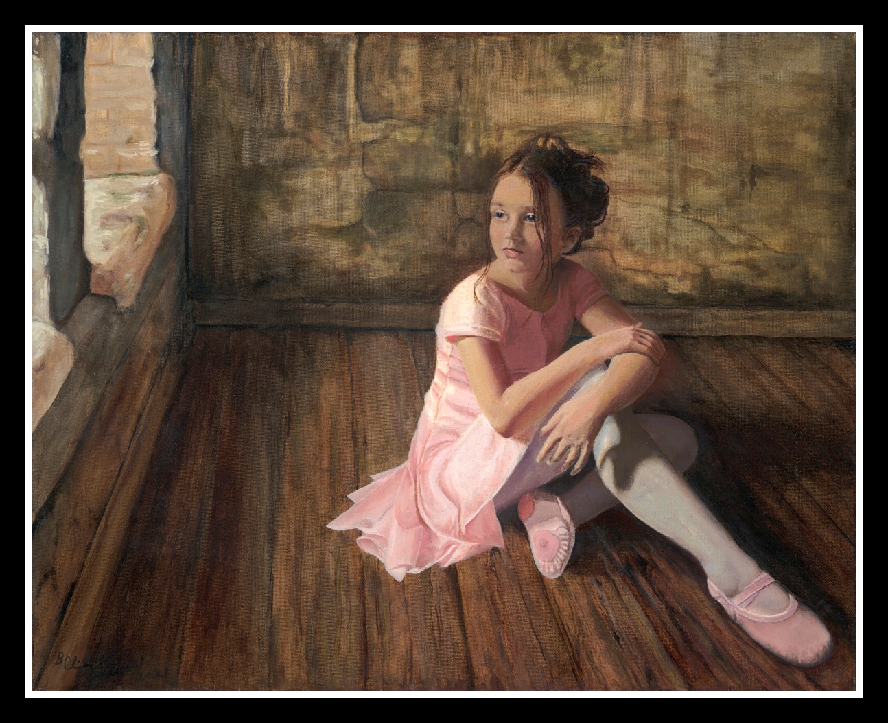 Immerse yourself in the tender beauty of “Ballerina in Repose”, an exquisite hand-painted oil on canvas by renowned Fine Art Artist Bonnie Collins. This captivating piece captures a young ballerina in a moment of quiet reflection, seated gracefully on a wooden floor as soft light filters through a nearby window. The delicate pink of her ballet dress and slippers contrasts beautifully with the earthy tones of the rustic room, creating a harmonious balance of innocence and timeless elegance.