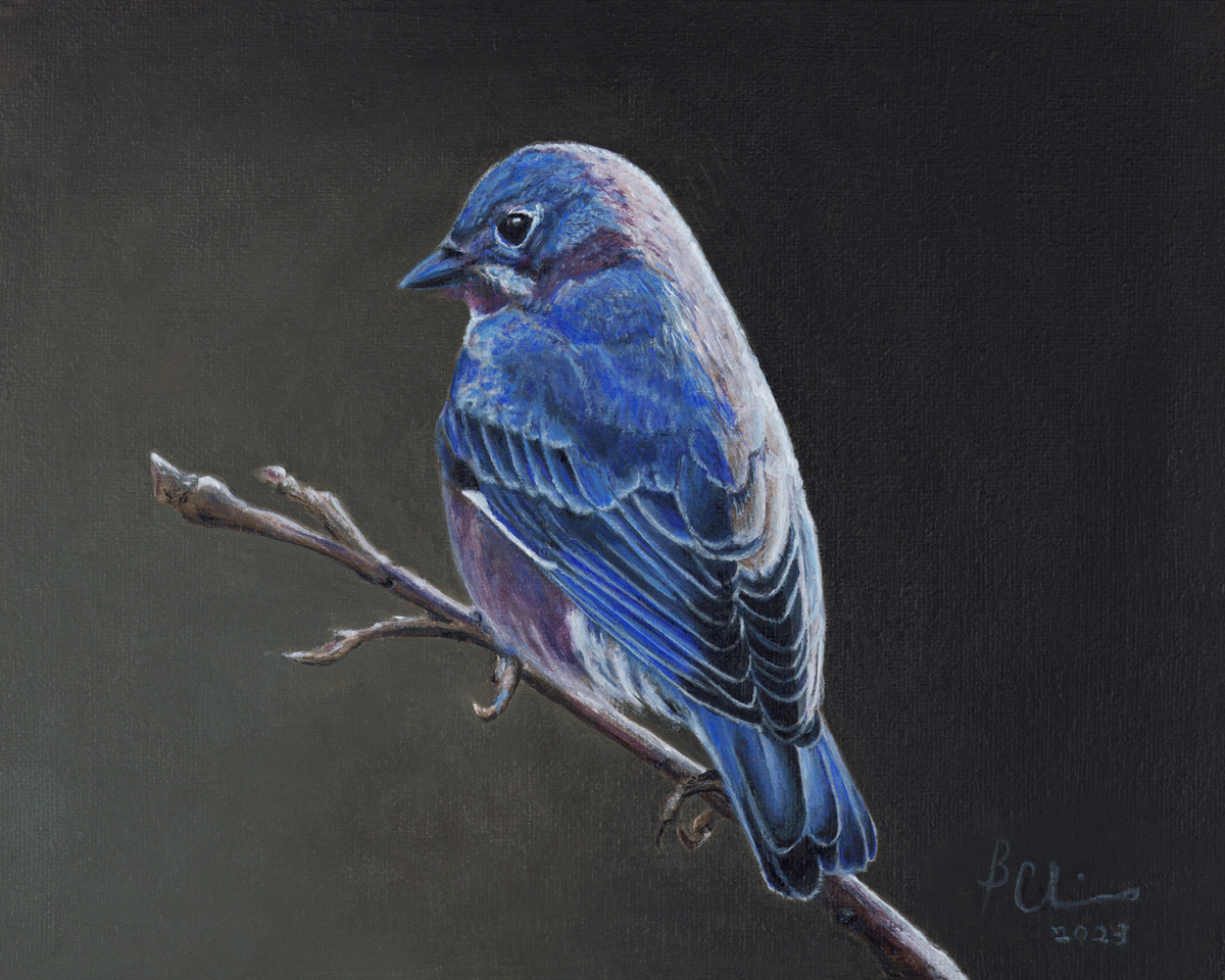 Immerse yourself in the delicate beauty of “Mountain Bluebird Haven,” an exquisite hand-painted oil on canvas by renowned Fine Art Artist Bonnie Collins. This captivating piece captures a graceful Mountain Bluebird perched on a slender branch, its vibrant blue feathers glowing against a dark, earthy backdrop. The bird’s soft, attentive gaze and the subtle interplay of light on its plumage evoke a sense of care and connection, reflecting its role as a devoted guardian of its family and companions in the wild.