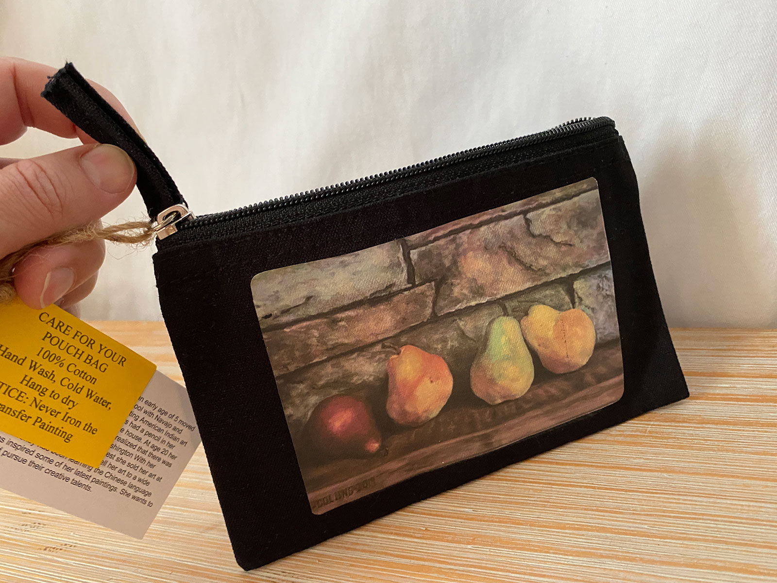 Elevate your style with the “Pears in Repose” handmade clutch, a stunning fusion of functionality and fine art by renowned artist Bonnie Collins. Crafted from organic cotton, this elegant black clutch features a silk-screened reproduction of Collins’ hand-painted pear fruit artwork, signed and dated 2021. The artwork captures three pears in soft, earthy hues of crimson, golden yellow, and pale green, resting against a textured stone wall backdrop. The delicate interplay of light and shadow in the design brings a timeless, rustic charm to the piece, evoking a sense of simplicity and natural beauty.