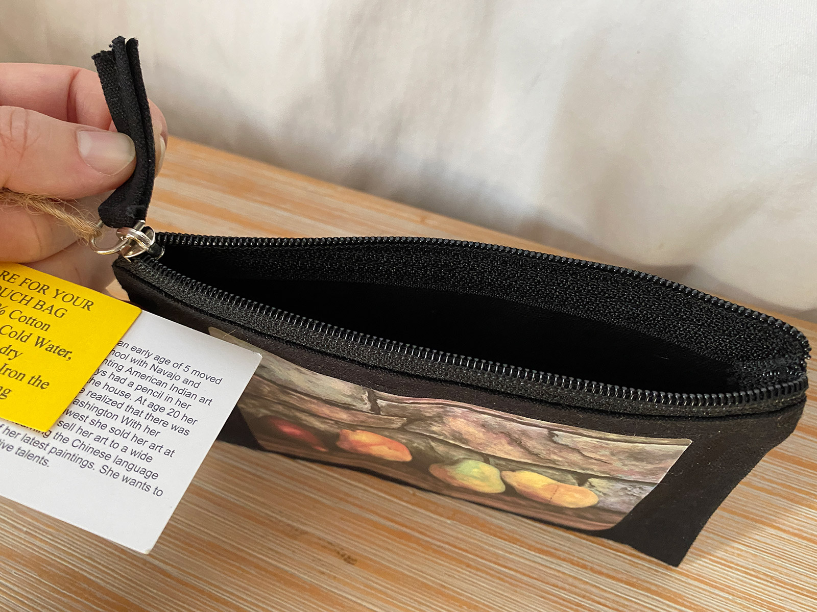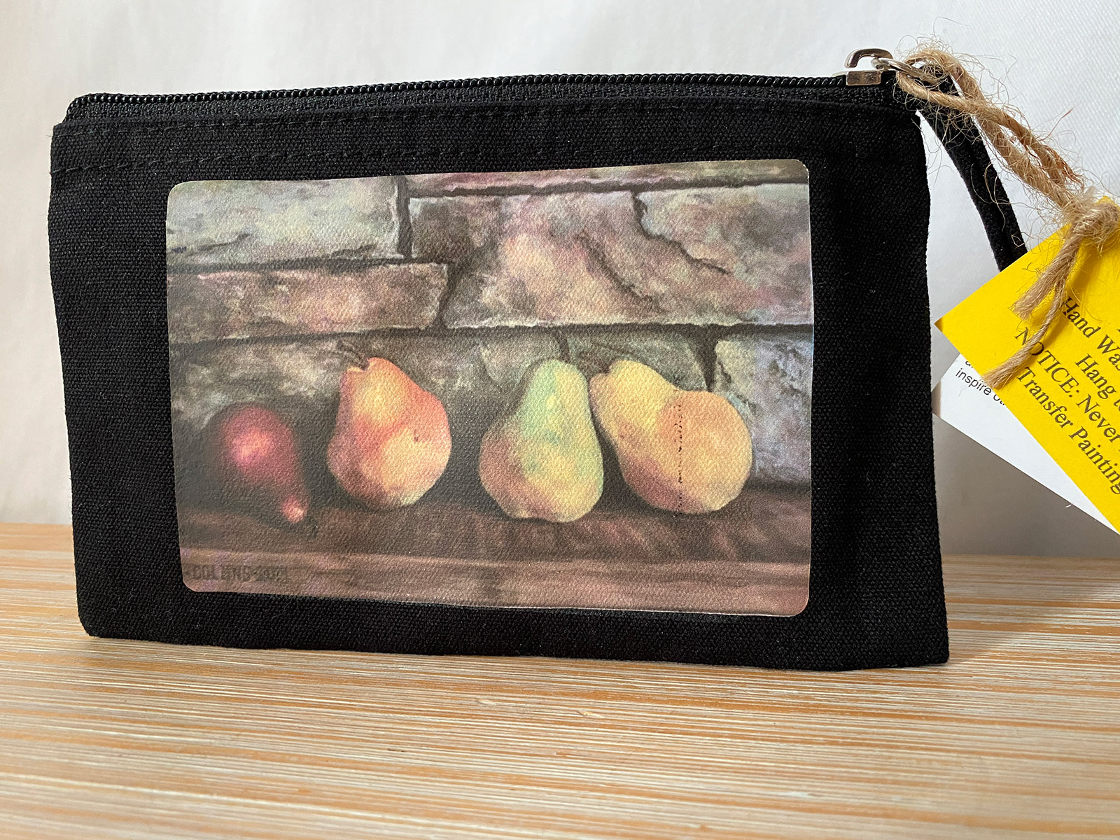 Bonnie Collins’ signature style shines through in the intricate details of the silk-screened pears, where each fruit seems to glow with a quiet warmth, inviting you to appreciate the artistry in everyday moments. The clutch is finished with a sturdy zipper and a rustic twine wrist strap, adding a touch of earthy elegance to its practical design. Perfect for carrying essentials with a flair of sophistication, this clutch measures [dimensions to be added], making it an ideal accessory for art lovers, nature enthusiasts, or anyone seeking a unique statement piece.