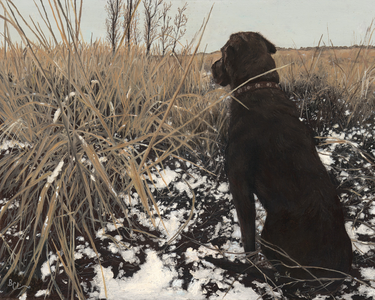 Bonnie Collins masterfully uses rich, textured brushstrokes to bring depth and emotion to this scene, evoking a sense of quiet vigilance and companionship. The interplay of light and shadow highlights the intricate details of the dog’s fur and the delicate snow-dusted grasses, inviting viewers to pause and appreciate the beauty of nature’s stillness. Measuring 16″ x 20″, this original artwork is a stunning addition to any art collection, perfect for those who cherish the bond between humans and their faithful companions, as well as the peacefulness of the outdoors.